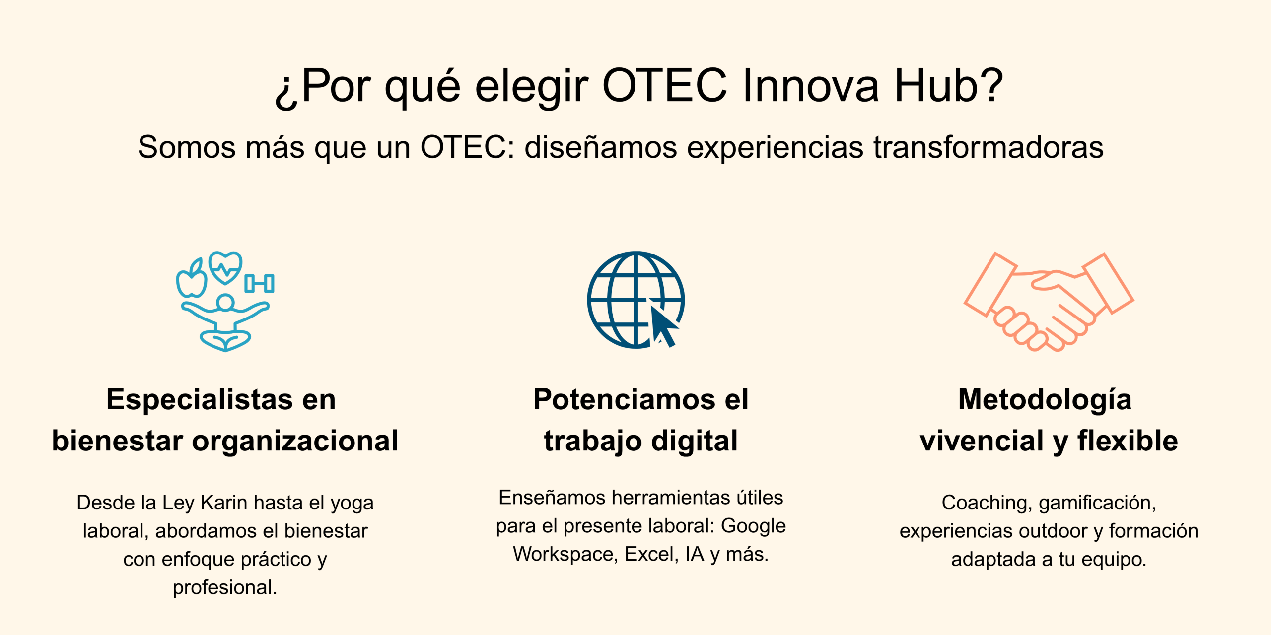 Capacitación con propósito Herramientas que transforman el bienestar y la productividad Conoce nuestros programas Agenda una reunión Nuestros programas Aplicación de Microsoft Excel para Análisis de Datos Curso práctico orientado al uso intermedio de Microsoft Excel como herramienta para organizar, procesar y analizar datos relevantes en contextos laborales. Ver programa Curso Ley Karin Cumple con la normativa vigente y promueve una cultura organizacional basada en el respeto y el bienestar. Ver programa Técnicas de Atención y Manejo de Clientes Difíciles Aprende a atender a clientes en situaciones desafiantes, manteniendo la calma, la asertividad y el enfoque en la solución. Ver programa SuscríbeteRecibe insights clave sobre aprendizaje corporativo y desarrollo de talento, directo en tu bandeja de entrada.Por favor, activa JavaScript en tu navegador para completar este formulario. Email Email *Enviar